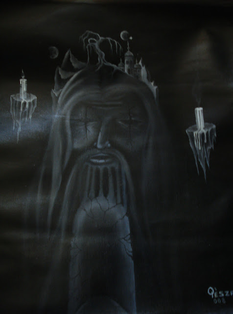 Hellish, dark and gothic nightmare of a Hungarian prisoner. The prophet-like face is blinded. Blinding is an important prison symbol. The face can be perceived also like a rock or a cliff. There is a church, a tree and a mountain at the top of the head. It seems that a tunnel opens at the bottom of the cliff. A tunnel means disappointments, evil rivals and failure. Note the cracks on the wall of the tunnel and in the eye sockets. These cracks can symbolize the exhaustion. Two candles are levitating on two hovering rock islands. The flames of the candles are still vivid. The candle is the symbol of the long-suffering but also of the toughness. The message is: I am not giving up the hope.